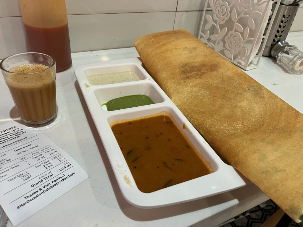 チャイとマサラ・ドーサ。チャイは濃厚で、マサラ・ドーサは優しい味。とんでもなく美味しいです^^